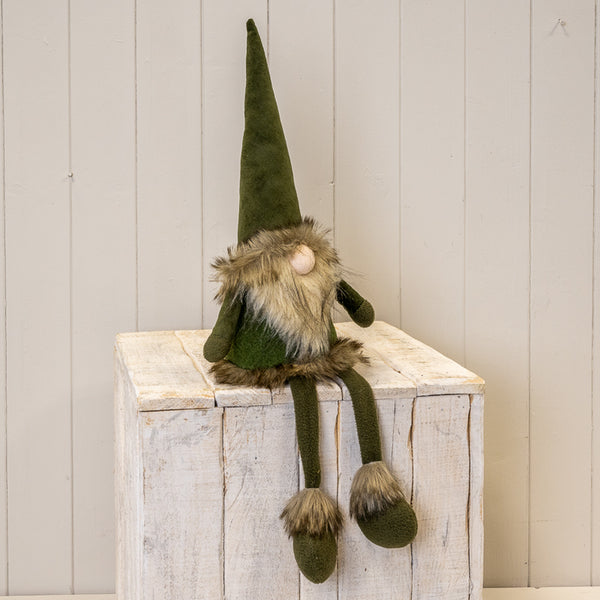 A tall fabric gonk in warm green tones that brings a cosy, playful touch to Christmas styling and winter décor.